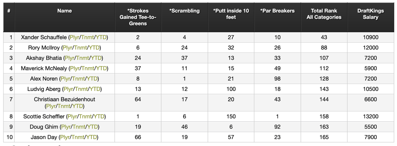 Looking at our key stats from above, we plugged them into our proprietary Golf IQ Composite ranking tool to give you a peek at the top 10 players based on selected criteria. Feel free to create your own listings based on your own criteria.
